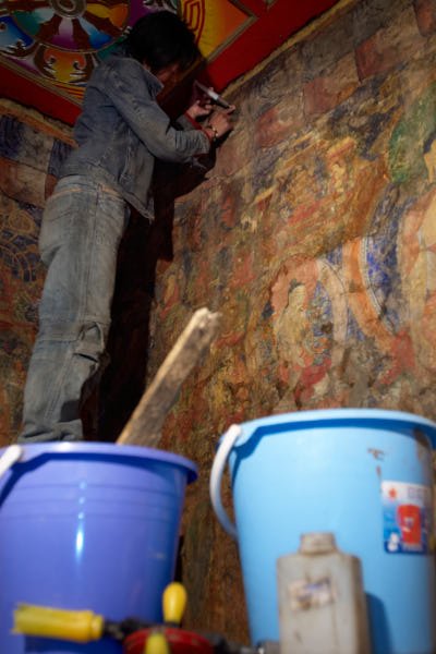 The temple is located in Wayao village, in the Sichuan region, and it consists of two stories, both of them painted. The restoration project was part of the training program sponsored by the Kham Aid Foundation, supported by Winrock International, Millepede Foundation and private donors and carried out in collaboration with John Sanday Associates. A local team composed by 11 trainees carried out the preservation of the wall paintings. The local team received guidance from Luigi Fieni and 5 members of the Wall Painting Conservation Team of Mustang, Nepal.