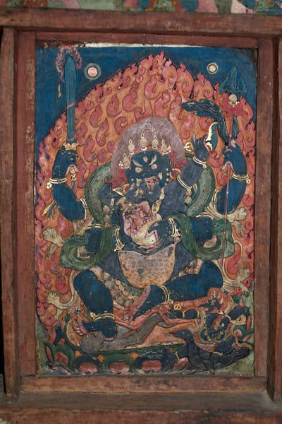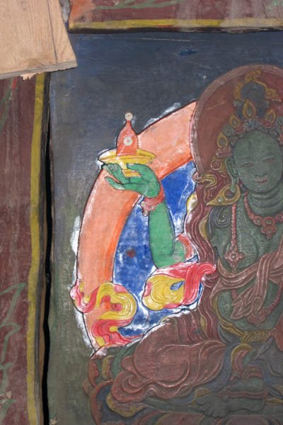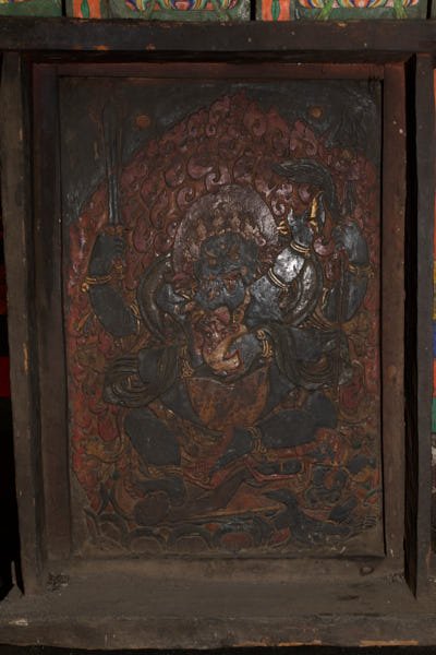 The slates: carved and painted slates are kept in four rooms of the monastery. They are present in different sizes and they are dated back from different centuries: it is clear the difference of style in many of them. All slates were carved and subsequently painted with natural pigments using a water-based binder. A thick varnish darkened by aging and smoke from butter lamps covered them all. The conservation work consisted only in the cleaning of the slates although it was a time consuming operation for the varnish accumulated inside the carving was quite difficult to be removed. The cleaning was performed with cotton swabs soaked in organic chemicals. Their wooden frame was cleaned too, following the same procedure.