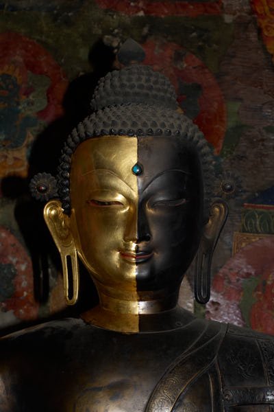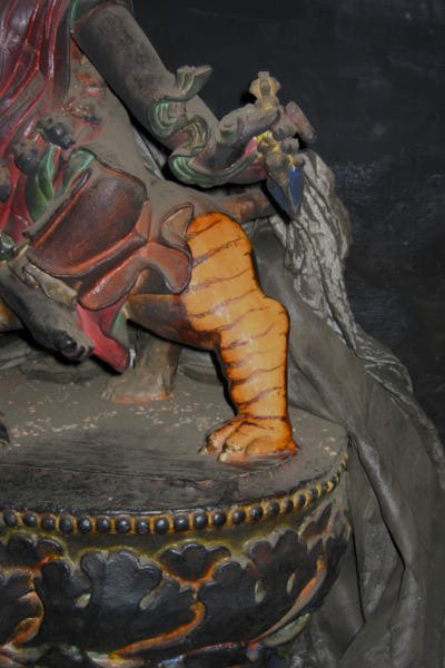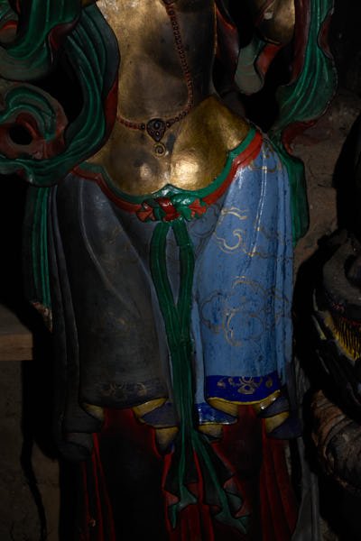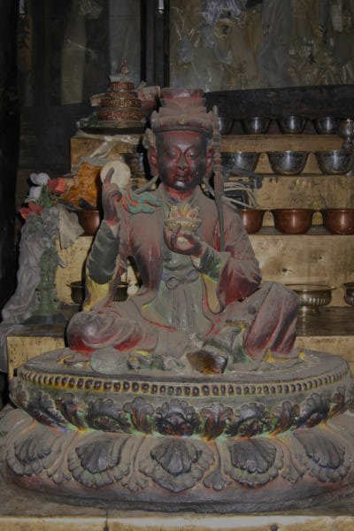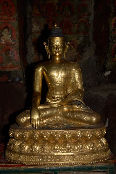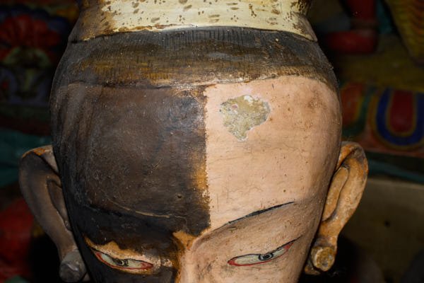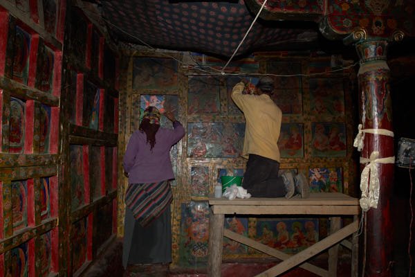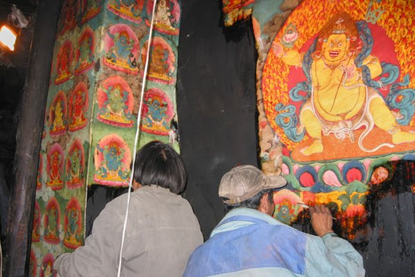 The statues: work focused of the consolidation and the cleaning of 24 statues made out of clay filled with bitten paper and two statues in copper repoussé, gilded with mercury. It is difficult to date all the statues, but some are attributable to the 15th century while others can be dated even earlier. Thick layers of aged varnish as well as heavy deposits of butter lamp smoke and mouse dung covered all statues. All the precarious elements of the clay statues and their broken parts were fixed through the consolidation process using different solutions of acrylic binder. The cleaning was then performed using cotton compresses soaked in organic chemicals. In some cases the soot was so resistant that the compress had to be left on the area to be cleaned for very long time before the varnish could be dissolved. After the compress was removed, cotton swabs soaked in the same chemical were used to clean off the aged varnish and very thin bamboo sticks were used to get rid of the soot from the carved patterns and the intricate jewelry. Following the monks' request, missing parts of the sculptures that were possible to be reconstructed were reproduced using the same technique of execution but they were left unpainted. Spatulas were used to shape the reddish clay mixture and the missing parts were slowly shaped.