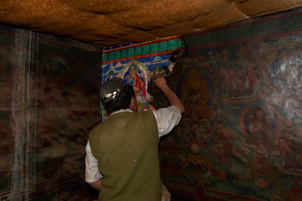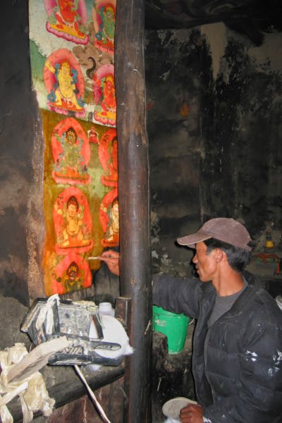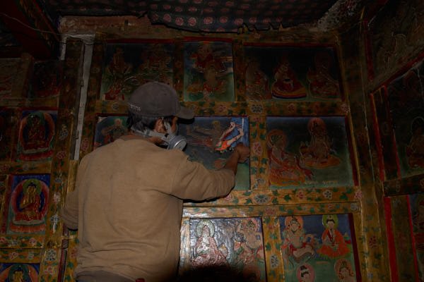 Begun in 2003, our restoration work focused on the consolidation and cleaning of the wall paintings. Centuries of deposits from butter-lamp smoke covered the paint layer with a thick coating of black soot and grime. The shrine, where the statue of Guru Rinpoche stands, was completely blackened; indeed, the grime was so thick that local people used to believe that the shrine contained no paintings. Beneath the smoke, there were two coatings of a heavily blackened varnish. Furthermore, some sections of the wall paintings were unsafe as a result of serious detachments of the preparatory layers.