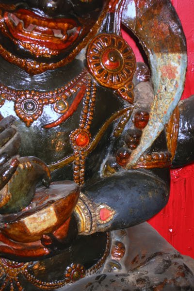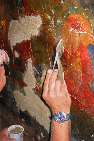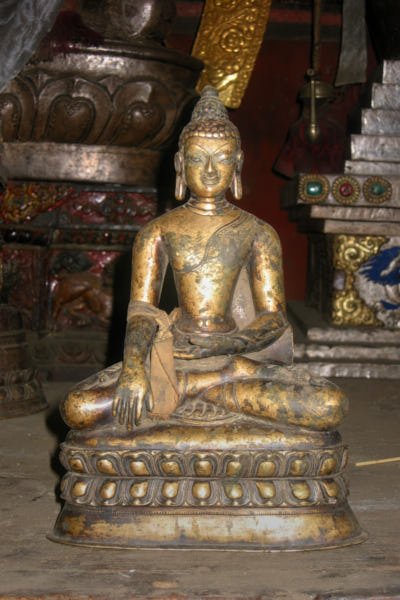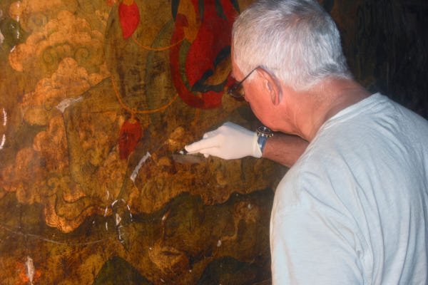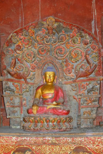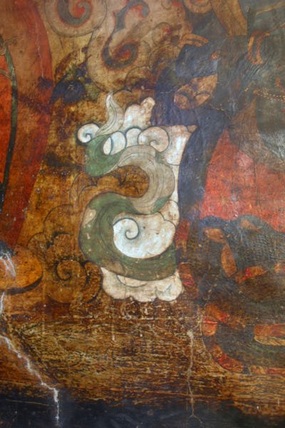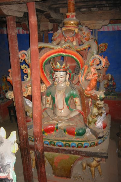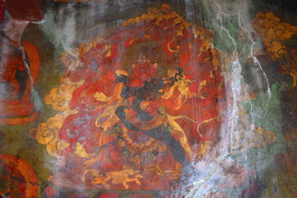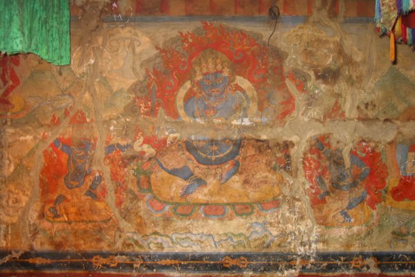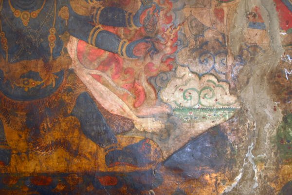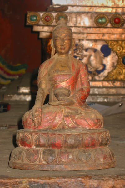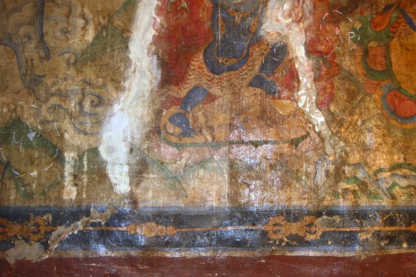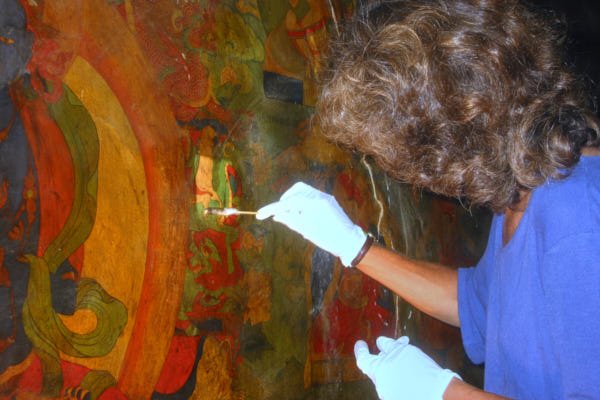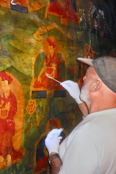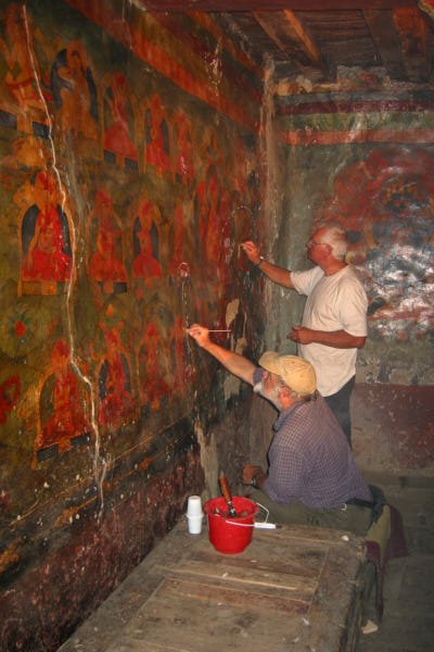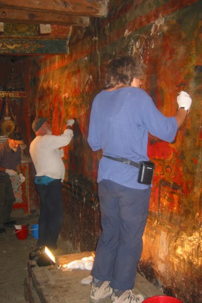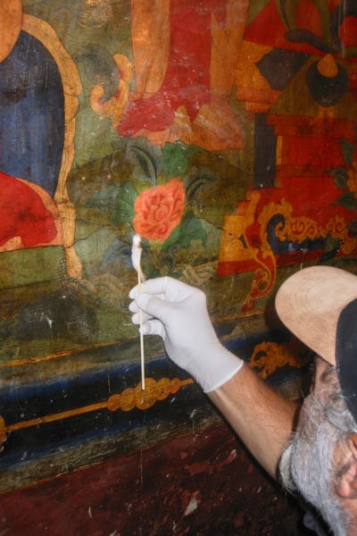 The project, started in 2003, was sponsored by The Rotary Club U.K. in collaboration with Nepal Trust and carried out by John Sanday Associates. The main aim was to train volunteer trekkers and locals in restoration techniques for the safeguarding of Halji’s cultural heritage. The first phase of the project consisted of emergency consolidation operations together with a study of the stratification of the soot and the varnish present on the surface of the wall paintings to find out the most suitable chemicals for their removal. In addition, cleaning samples were carried out in different areas so as to check the efficacy of the solutions. The cataloguing of all statues and artefacts present in the monastery was another important achievement. In total, 117 statues and chortens made from clay, metal and wood were identified, measured and photographed.