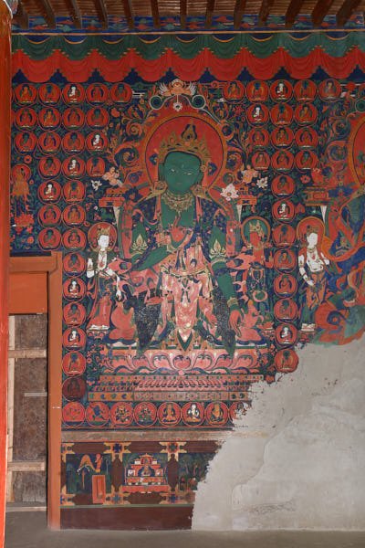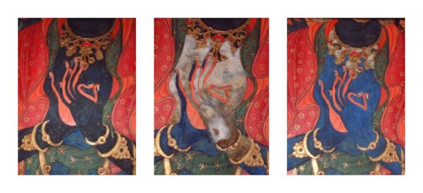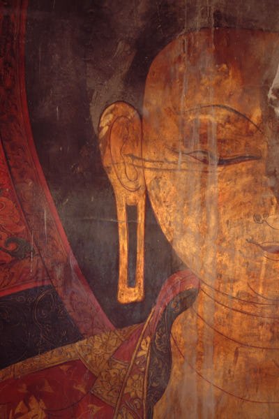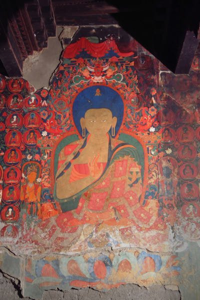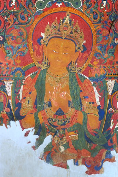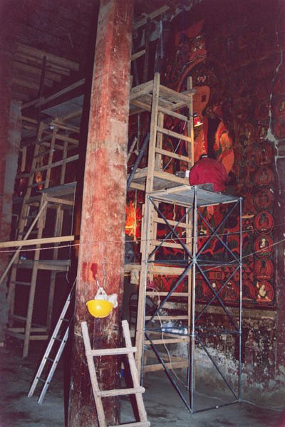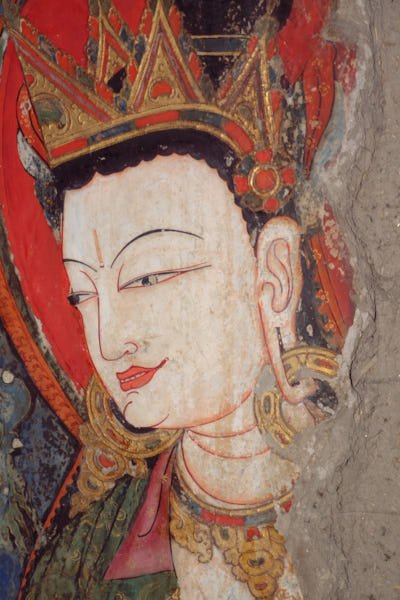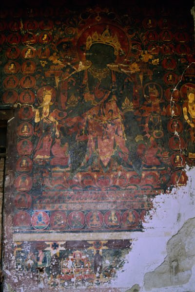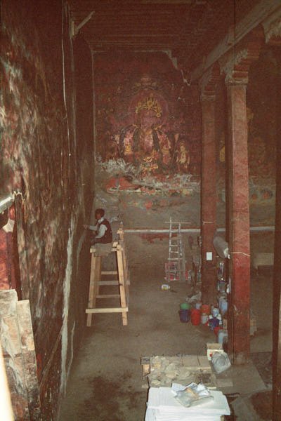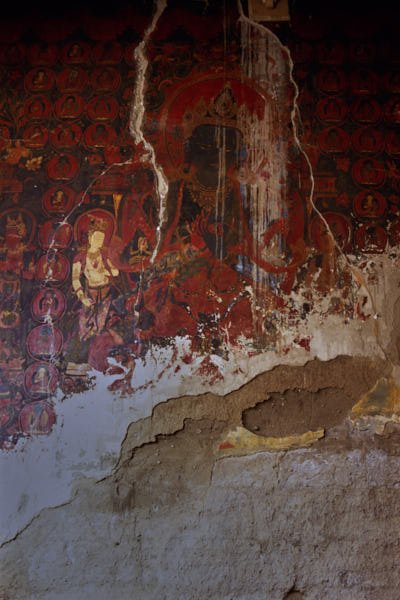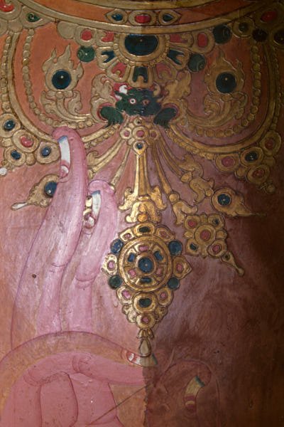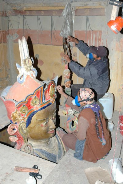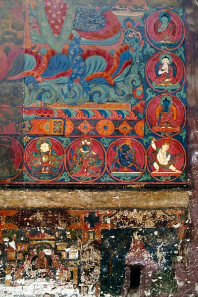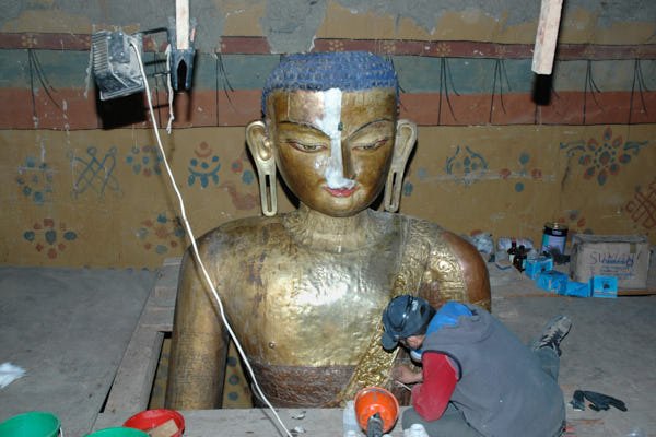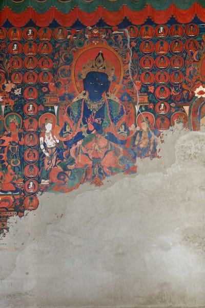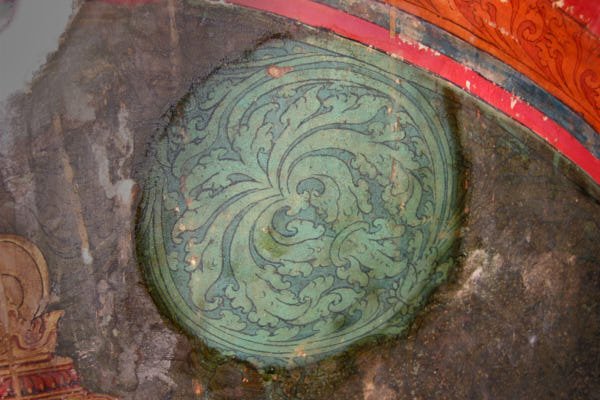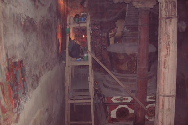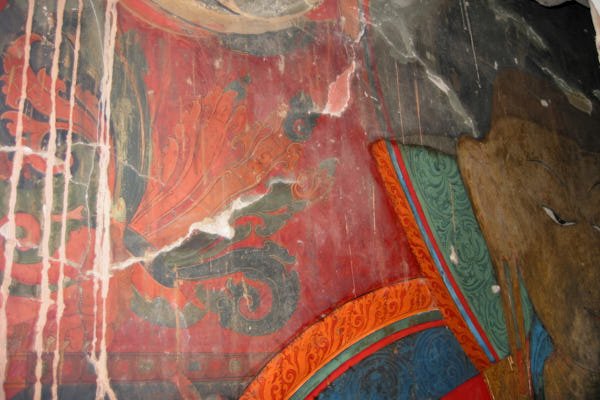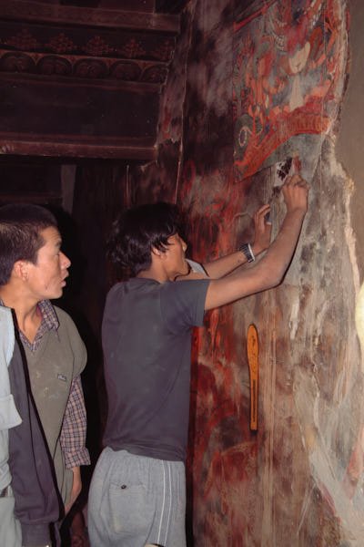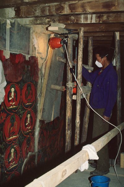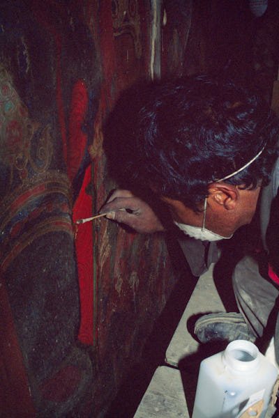 Cleaning procedure: this task was a highly complex procedure. After laboratory analysis were carried out, it was possible to identify the composition of both the pigments employed by the artists as well as the dirt to be removed. In that way, we were able to determine an effective cleaning method. The original coating of varnish applied in the 15th century altered so much due to aging that the paint layer was completely darkened by it while centuries of butter lamp smoke and grime had turned the upper sections of the paint layer nearly black. In addition, large areas of the original paint layer bordering with a recent stone buttress were heavily overpainted and some sections of new paint had covered the original murals as well. Given the different reaction of the pigments to the use of the same chemical, every color often required the use of a different process and solvents to remove both the varnish, the grime deposits and the overpaintings. The use of Japanese tissue paper and/or cotton compresses soaked in different chemicals yielded a homogeneous cleaning while still protecting the paint layer. To clean the gilding and the embossed gilt jewelry, a special cotton compress, soaked in organic solvents, was applied for a long time to the exceedingly resistant varnish.