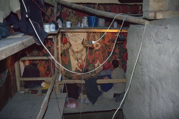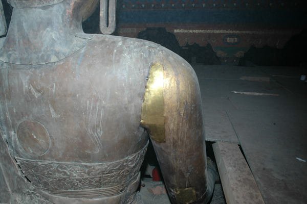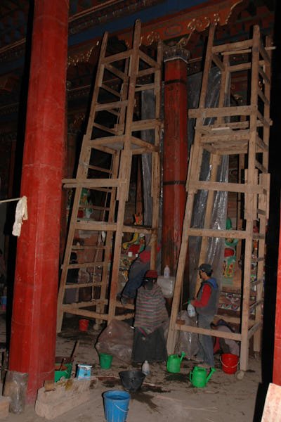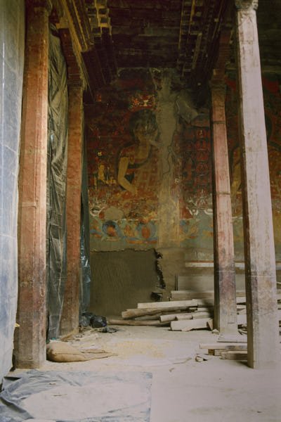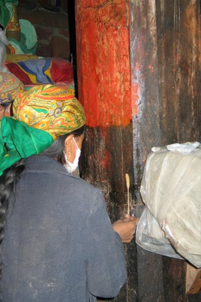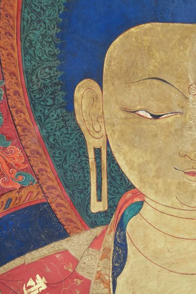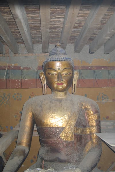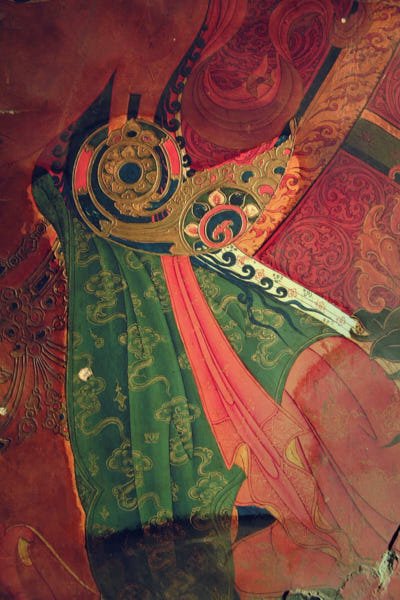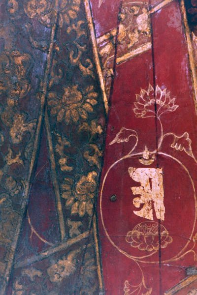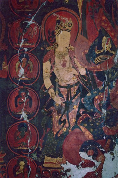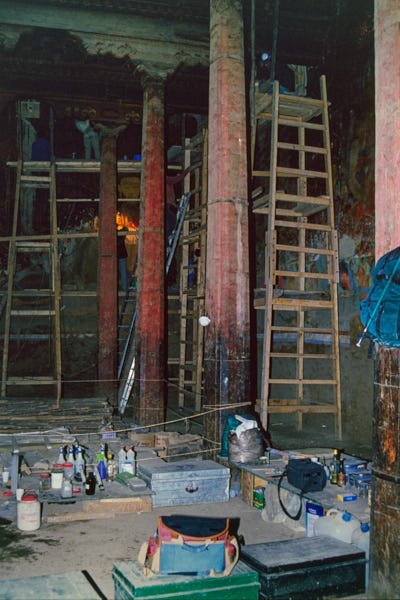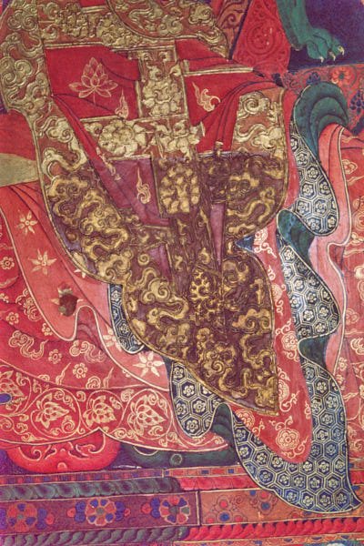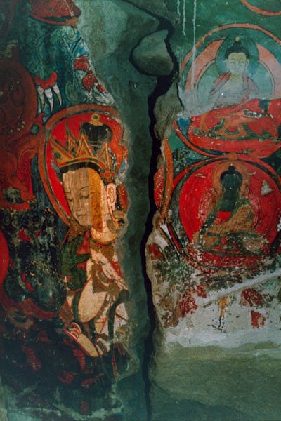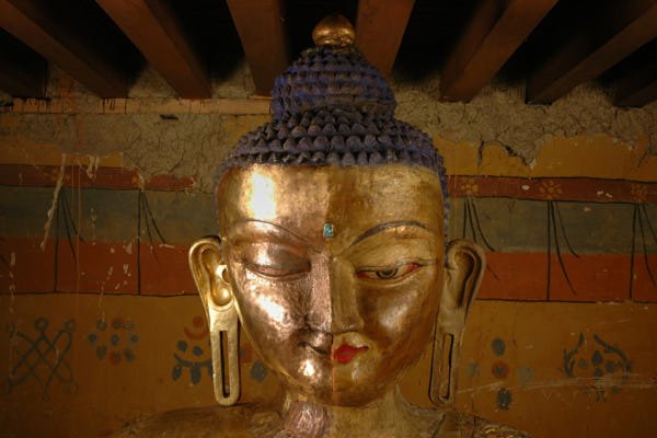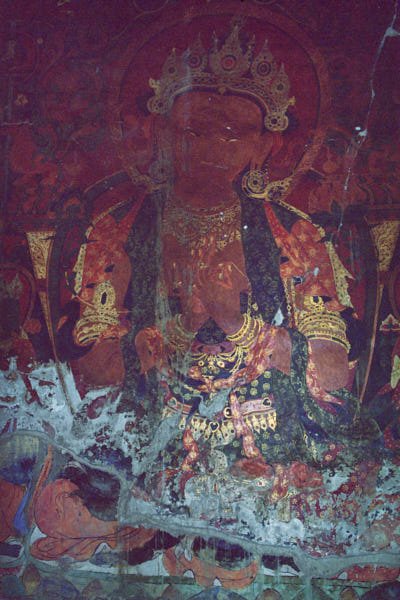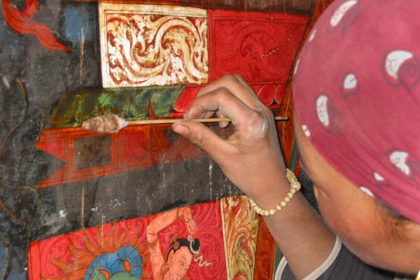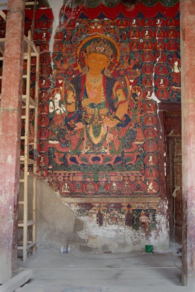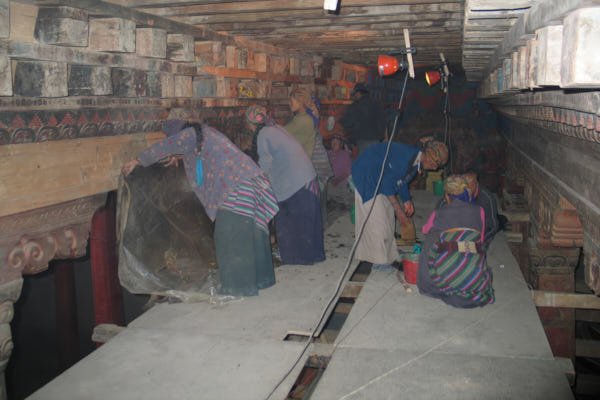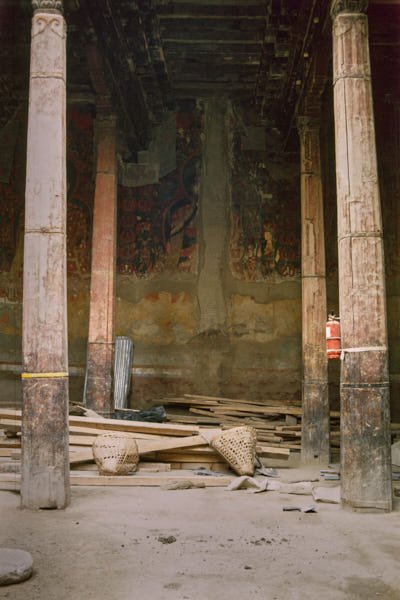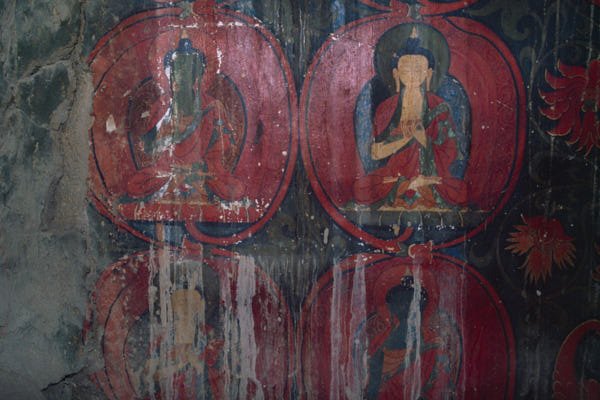 Cleaning procedure: this task was a highly complex procedure. After laboratory analysis were carried out, it was possible to identify the composition of both the pigments employed by the artists as well as the dirt to be removed. In that way, we were able to determine an effective cleaning method. The original coating of varnish applied in the 15th century altered so much due to aging that the paint layer was completely darkened by it while centuries of butter lamp smoke and grime had turned the upper sections of the paint layer nearly black. In addition, large areas of the original paint layer bordering with a recent stone buttress were heavily overpainted and some sections of new paint had covered the original murals as well. Given the different reaction of the pigments to the use of the same chemical, every color often required the use of a different process and solvents to remove both the varnish, the grime deposits and the overpaintings. The use of Japanese tissue paper and/or cotton compresses soaked in different chemicals yielded a homogeneous cleaning while still protecting the paint layer. To clean the gilding and the embossed gilt jewelry, a special cotton compress, soaked in organic solvents, was applied for a long time to the exceedingly resistant varnish.