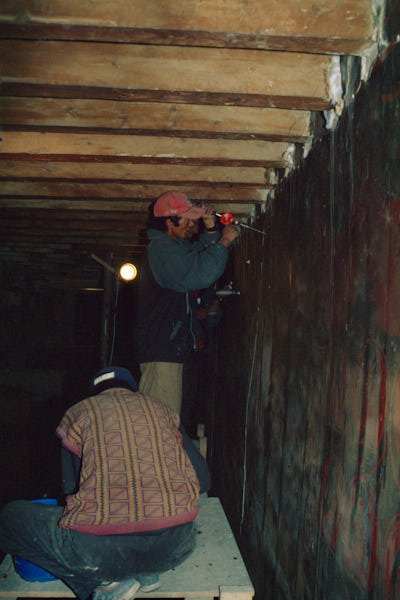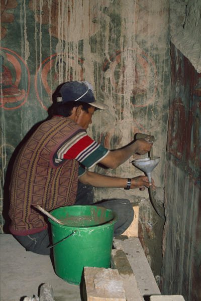 Then the work concentrated on fixing the preparatory layers. Through aging, earthquakes and some time mistakes in the technique of preparing or applying the plasters, it happens that these preparatory layers detach from one another. This creates random gaps between layers, which can cause the paintings to fall off with time. It is then necessary to fill all these gaps to reconstitute stability to the support of the wall paintings. Tapping with knuckles easily identifies the gaps. When doing so, a gap is found by the different sound the tapping produce. When a gap was found, we had to pierce the murals using hand-drills and reach the gap. Then the gap was cleaned by hand-syphon: in this way a slight vacuum would extract all debris. A surfactant solution was then injected to allow the glue to spread more evenly through the gap. When the gap was very small, it was enough to inject an acrylic binder solution. When the gap was larger, this binder had to be mixed up with clay, thus producing a mortar that would fill up the gap.