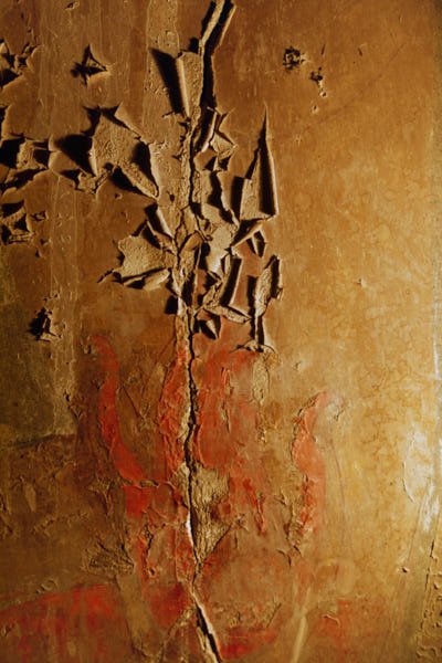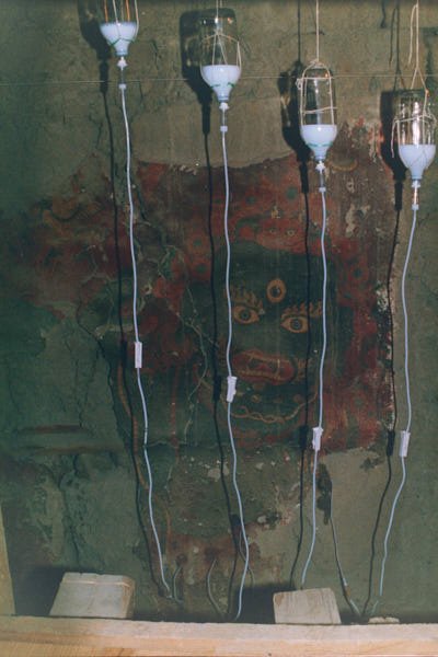 In addition, very large flakes of paint layer were present randomly all over the wall paintings. These flakes of paint layer were firstly softened by a surfactant solution. Then an acrylic solution was injected under the paint layer scales either by syringe of by soft pointed paintbrushes. Japanese tissue paper was subsequently applied on the area to be trated and the paint layer flakes were pressed back in position through the use of slightly wet cotton swabs.