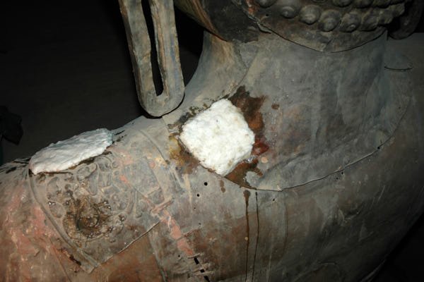 Upon completion of the conservation work in 2004, the paint layer was protected by spraying a very diluted solution of Paraloid B72.