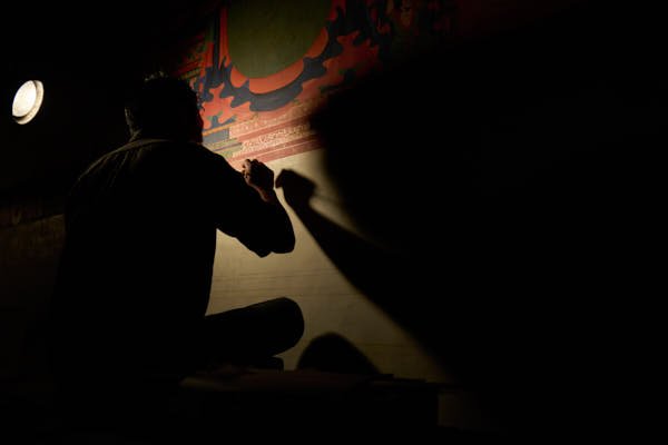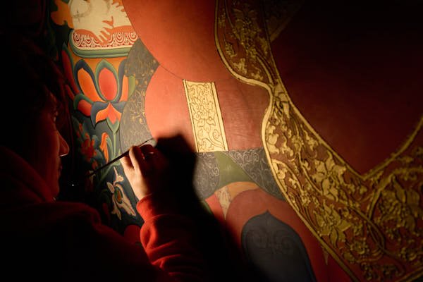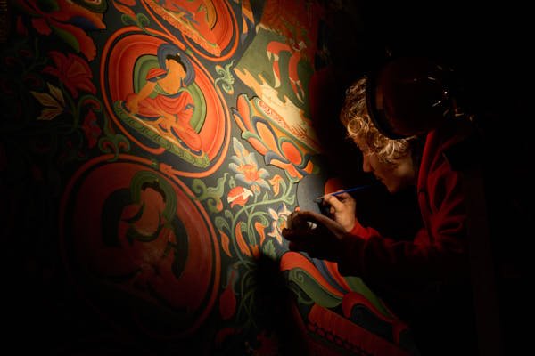Given the religious importance of the main deities that were painted in real gold it was decided to use 24K gold powder to paint the missing parts of the main Buddhas's body parts such as legs, arms, feet and hands where missing, following the monks's request to not contaminate the body of the images with impure elements. Furthermore, the floral decorations, the brocades and the patterns of the main deities and their attendants were painted with 24K gold powder as well so as to make the joints of the new painting with the old one as seamless as possible.