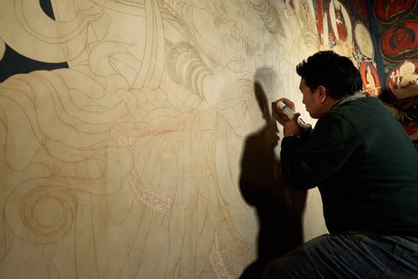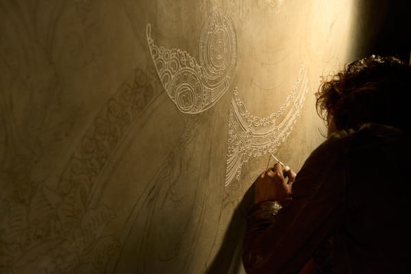 The original relief work was used to create the jewelry and the brocades of the Buddha robes. Jewels, brocades, patterns and floral decorations vary from figure to figure and they were all copied on drafting paper and reproduced accordingly. Once the drawing was transferred to the wall, the relief work was carried out by outlining the sketch with a syringe and a truncated needle filled up with an acrylic based paste. In this way the outlines of the drawing slowly became embossed.