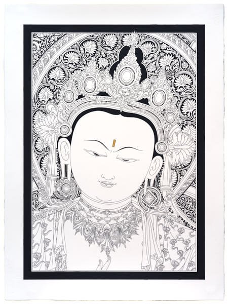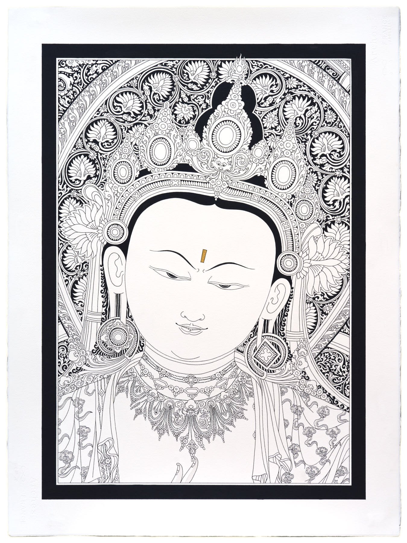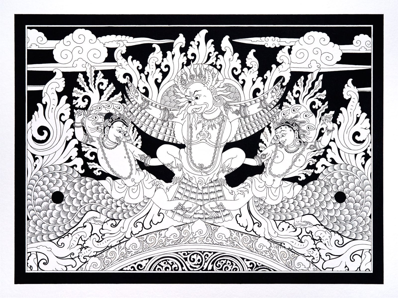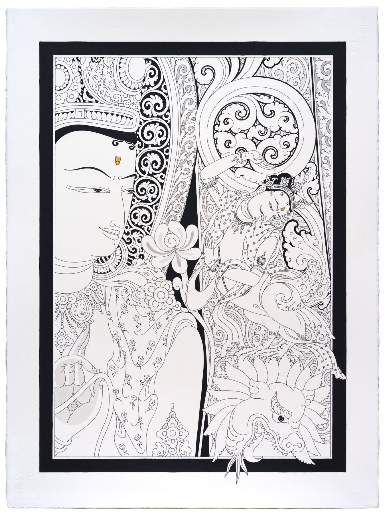 The overwhelming beauty and intricate detail of ancient Tibetan art can sometimes obscure the elegance of the lines and the mastery of the original drawings. It is this very essence that I seek to highlight in my work. Focusing primarily on details and compositions from 14th-15th century wall paintings found in the temples and caves of Upper Mustang, I strip away the color and even the shading, to reveal the underlying grace of line and form. By working in black and white, I allow viewers to appreciate these captivating themes and details in a fresh and insightful way.