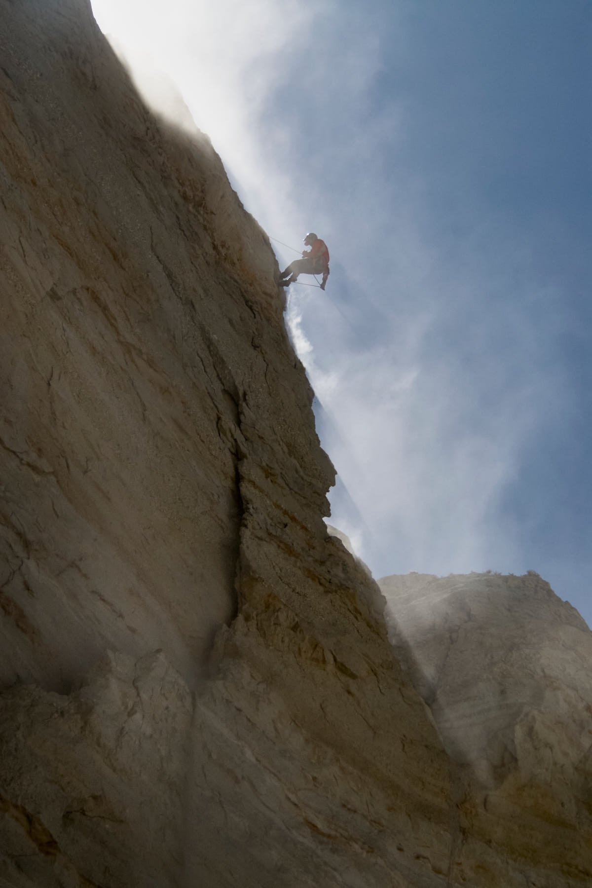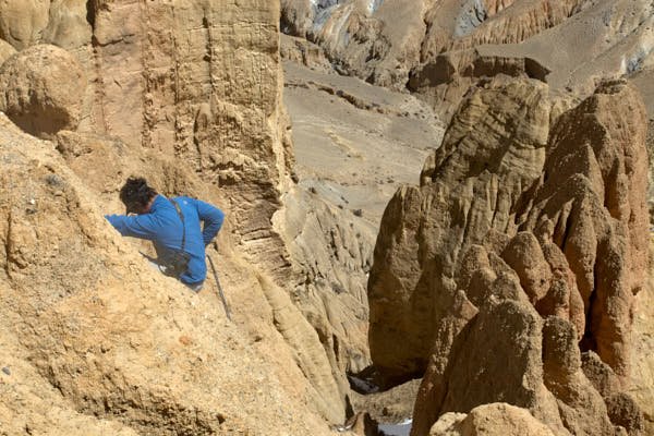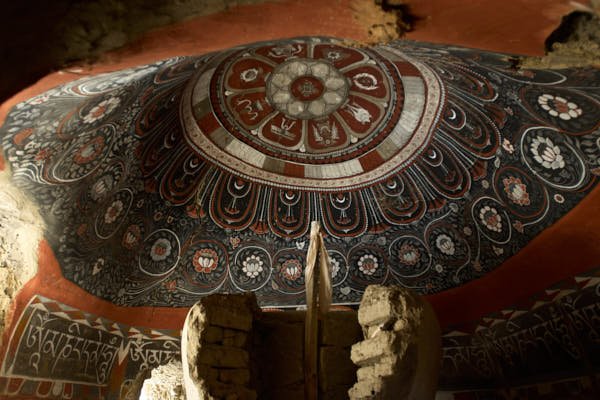 In 2007 a team co-led by U.S. researcher and Himalaya expert Broughton Coburn and veteran mountaineer Pete Athans, in collaboration with The North Face and National Geographic, scaled the crumbling cliffs on a mission to explore the human-made caves. Inside the caves, the team found ancient Tibetan Buddhist shrines decorated with exquisitely painted murals, including a 55-panel depiction of Buddha's life.
