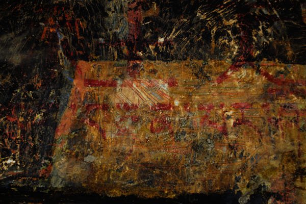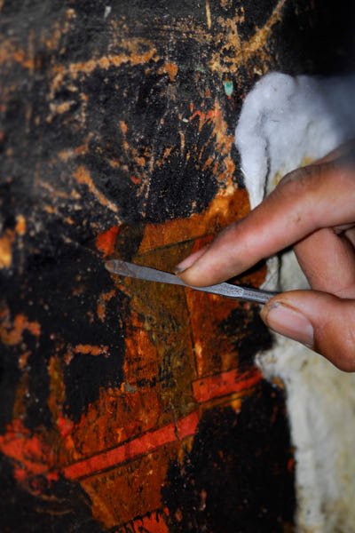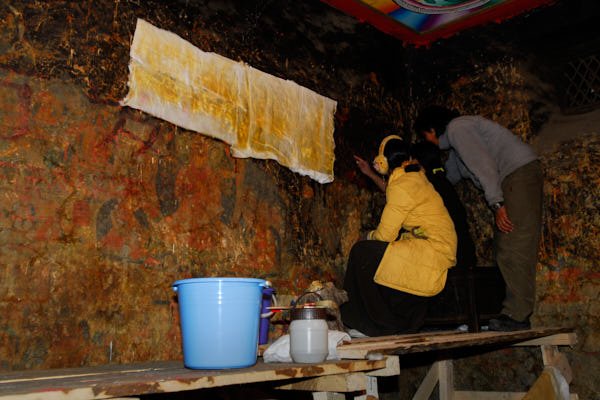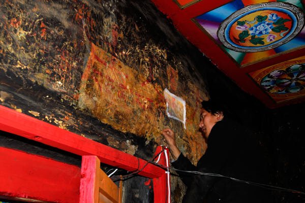 Furthermore, the paint layer was covered with a thick coating of mud, in some cases more than 3 mm. Oral memory from the local community recounts that this story had been used as a kitchen for a long time so that almost everything in the room was covered by black soot and grime. Luckily, the coating of mud had protected the murals. Local people had tried to clean that coating and the black soot as best as they could. As a consequence, they managed to damage seriously the lower section of the paint layer on all the three walls. On the south and west side, some patches of painted canvas were pasted onto the wall paintings.