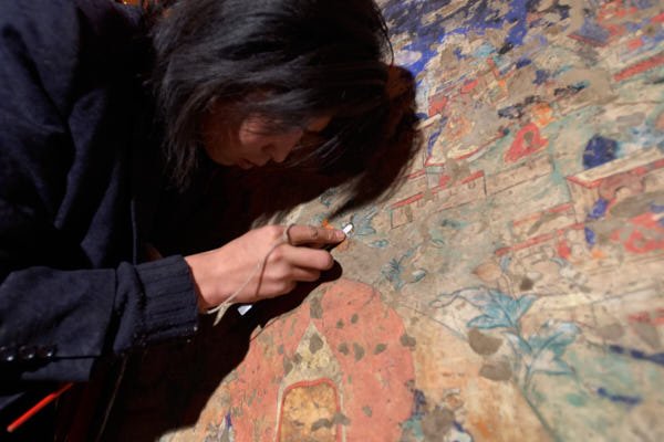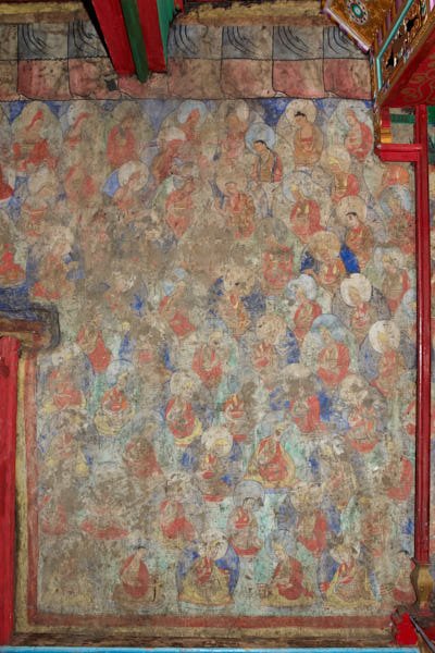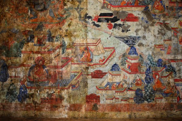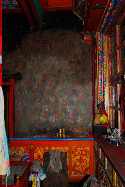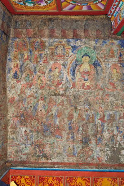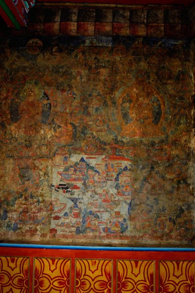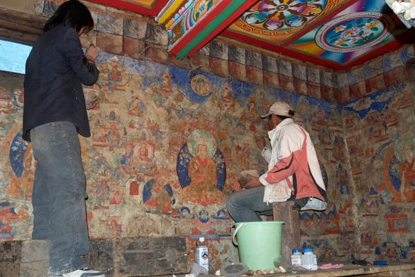 The quality of the wall paintings varies remarkably from the first to the second floor. The paint layer on the first floor is much rougher than the second floor and the style of painting appears to be much more recent than the upper floor. Inconsistencies in the pictorial cycle of the images on the first floor suggest that it was probably repainted. The structural wall of this temple was made of stones piled up apparently without binder. On top of the stones, a coating of clay mixed with straw was applied to create a kind of even surface to host the pictorial layer. The thickness of this coating varied greatly, according to the voids created by the irregular stones constituting the wall. The binder of the paint layer in all the stories was water based as taht is the tradition with most of the Tibetan art.