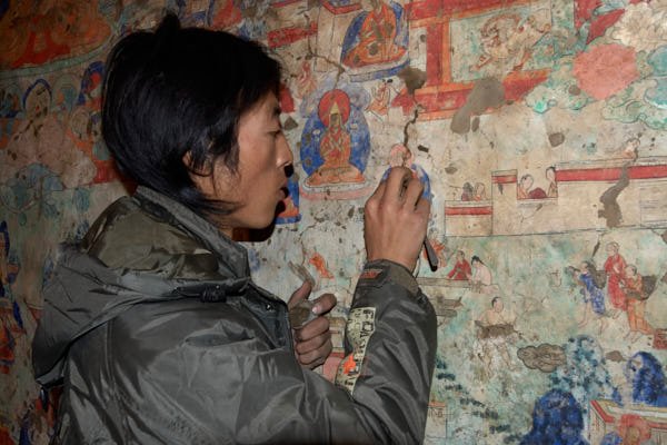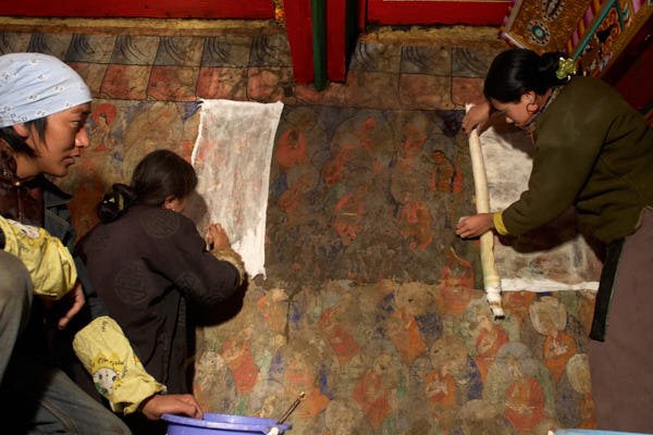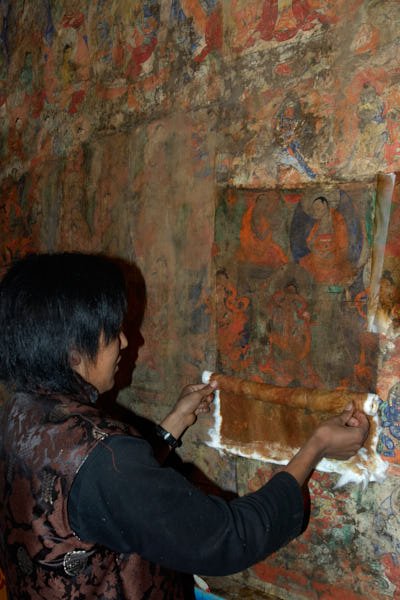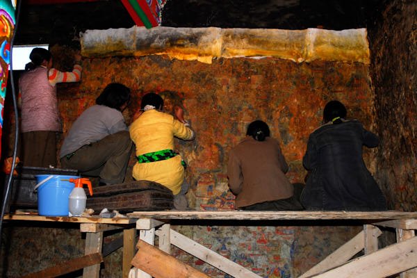 The temple is located in Wayao village, in the Sichuan region, and it consists of two stories, both of them painted. The restoration project was part of the training program sponsored by the Kham Aid Foundation, supported by Winrock International, Millepede Foundation and private donors and carried out in collaboration with John Sanday Associates. A local team composed by 11 trainees carried out the preservation of the wall paintings. The local team received guidance from Luigi Fieni and 5 members of the Wall Painting Conservation Team of Mustang, Nepal.
