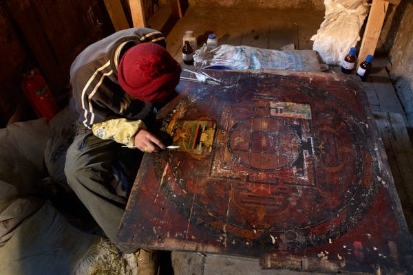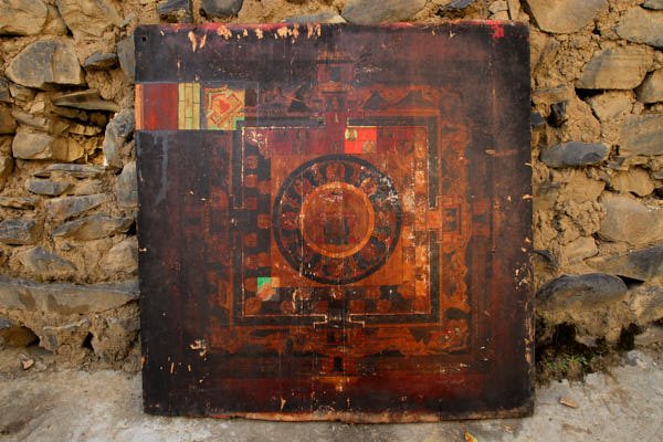 Wooden ceiling: Three mandalas were present on the ceiling of the second story: they looked contemporaneous to the murals. They were painted on square panels made out of different wooden planks. After the mandalas were removed from the ceiling it was noticed that some of the planks did not adhere properly and they might have separated. It was decided to glue the planks after the cleaning because the chemical used for that purpose could have melt the binder used for fixing the planks. All mandalas were cleaned off the varnish and the soot deposits employing cotton swabs soaked in organic chemicals. Soon after, the planks were glued with a PVA binder and they were protected with a 3% solution of Paraloid B72.