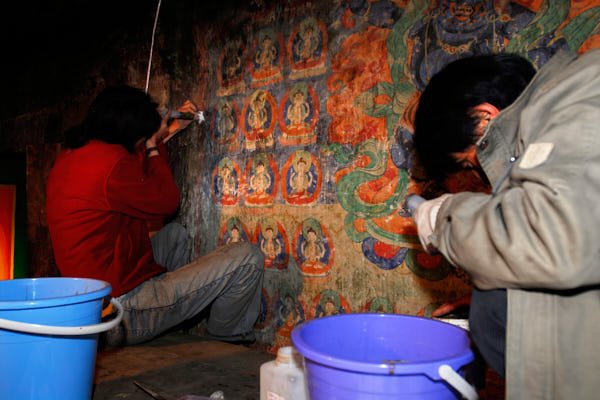 Second story: the painted surface covered three walls only for there was a huge altar all along the forth one. The state of preservation was extremely appalling for the wall paintings had been subjected to vandalism acts and they were severely damaged. More than 30% of the paint layer was randomly detached from the stone based wall and several cracks were present on the painted surface. The protective varnish turned brownish with ageing and it would impede a clear vision of the pictorial cycle. On top of that, the wall paintings had been over painted with writings in Chinese and Tibetan with a deep red color.