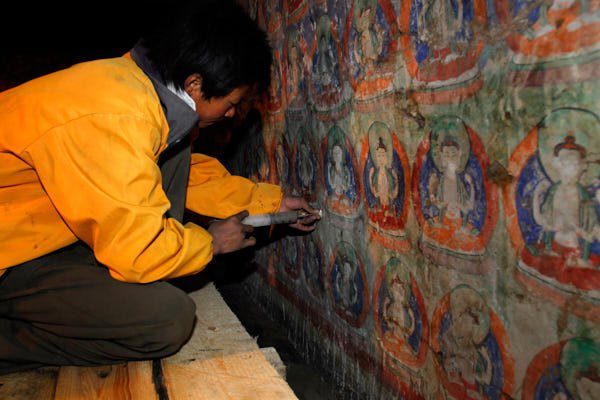 First story: the preparatory layer was fixed back to the stone based wall through injections of mortars and gluing solutions based on PVA binders. The small detachments were filled up with an acrylic emulsion dispersed in water. As for the deepest detachments, they were filled up with a mortar composed of local clays and a PVA binder. Tests were carried out to find out the most suitable clays to be injected. The mortar was then made of 2 kinds of local clay mixed with a PVA binder. Prior any injection, a surfactant solution was instilled through syringes. Where it was possible, existing cracks were used for the injections but in most of the cases, holes had to be done using hand-drills with bits whose width varied from 1 to 2 mm of diameter. Care was taken while drilling in order not to damage important outlines, figures or inscriptions. Since the amount of water in any mortar or solution would evaporate, some detachments could still not sound still underneath the surface of the wall paintings. Thence, the consolidation was checked every few weeks for the whole length of the project and more injections were carried out where needed.