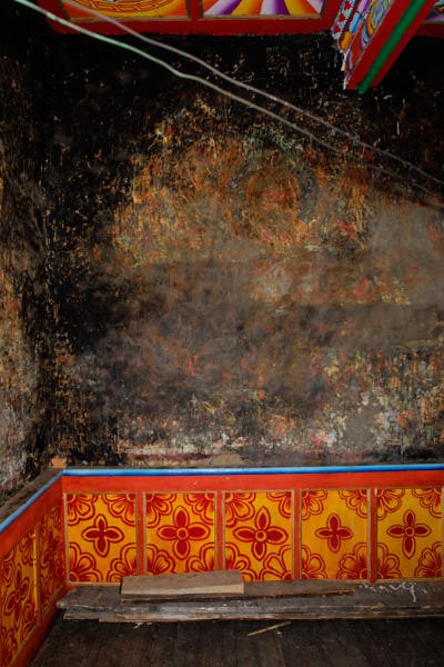 Wooden ceiling: the ceiling in the second story is made of a series of interlocked wooden painted panels. The majority of the panels were over painted in 2004 and only 3 panels depicting mandalas had been left untouched. After some cleaning samples were carried out, it came out that all the panels still presented original paintings underneath. Although all of them were heavily darkened from the application of a very old and altered varnish, the paint layer was still looking in good conditions. Between the varnish and the over paintings laid a thick deposit of soot from smoke.