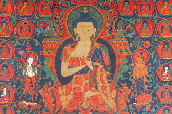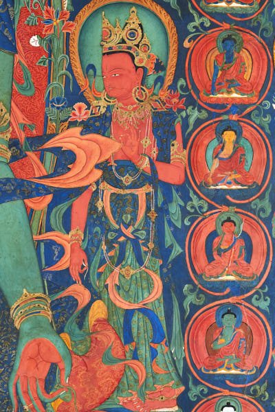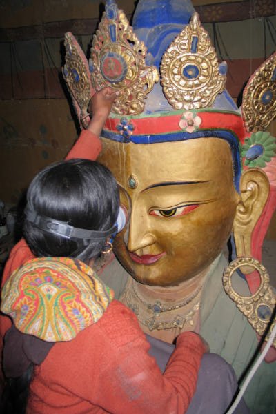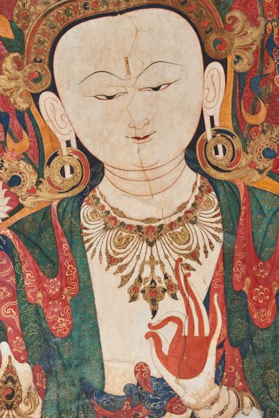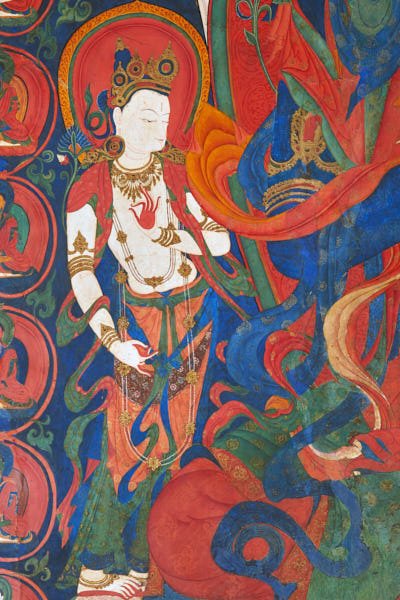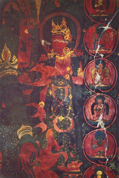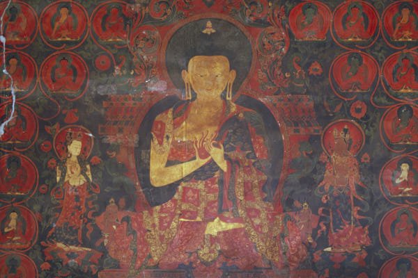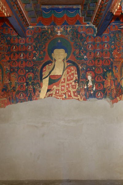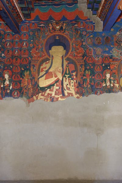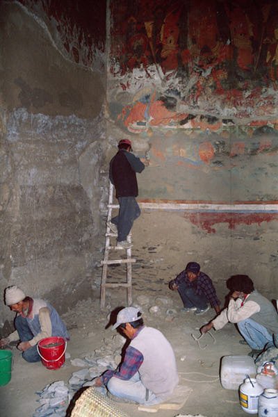 Cleaning procedure: this task was a highly complex procedure. After laboratory analysis were carried out, it was possible to identify the composition of both the pigments employed by the artists as well as the dirt to be removed. In that way, we were able to determine an effective cleaning method. The original coating of varnish applied in the 15th century altered so much due to aging that the paint layer was completely darkened by it while centuries of butter lamp smoke and grime had turned the upper sections of the paint layer nearly black. In addition, large areas of the original paint layer bordering with a recent stone buttress were heavily overpainted and some sections of new paint had covered the original murals as well. Given the different reaction of the pigments to the use of the same chemical, every color often required the use of a different process and solvents to remove both the varnish, the grime deposits and the overpaintings. The use of Japanese tissue paper and/or cotton compresses soaked in different chemicals yielded a homogeneous cleaning while still protecting the paint layer. To clean the gilding and the embossed gilt jewelry, a special cotton compress, soaked in organic solvents, was applied for a long time to the exceedingly resistant varnish.