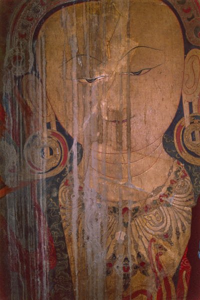 Pictorial integration: the retouching process was organized following two different methodologies: touch up and reconstructions. The former, used mostly in all walls, was meant to tone down abrasions and small losses of paint layer in order to balance all colors. This task was performed using a selected series of watercolors with minimal light sensitivity. The latter, proposed and later approved either by John Sanday Associates and Rodolfo Lujan Lunsford was to reconstruct a large area in the upper register of the east wall's northern side and two very damaged Buddhas in the south wall. The reconstructions were made possible by coping original elements from the pictorial cycle and by making them anew in the required areas (e.g. the half head of a Buddha or his robe). So, when all required elements for a reconstruction of the paint layer were found, life-size sketches were drawn on tracing paper and the drawing transferred to the wall with the spolvero technique. Natural pigments mixed with Arabic gum were then used as base-colors for covering the wide lacunae and the large cracks to be reconstructed. The new paintings were then completed with watercolors and fake gold where needed.