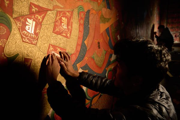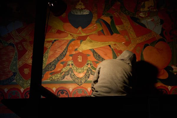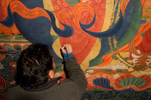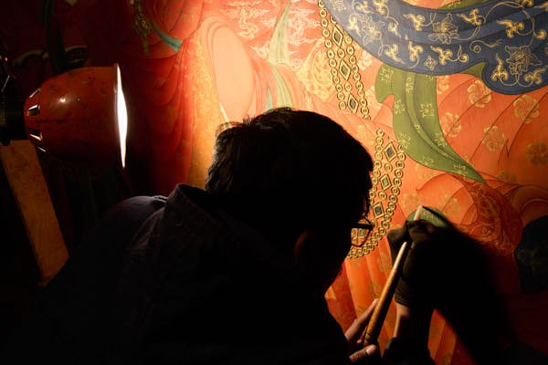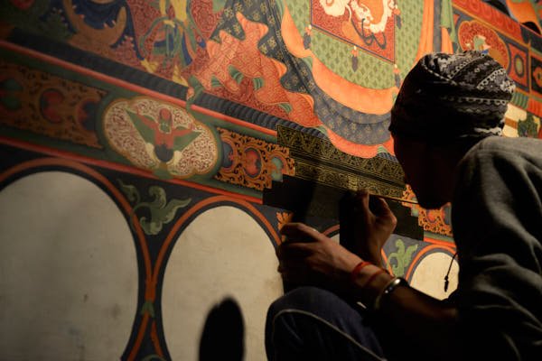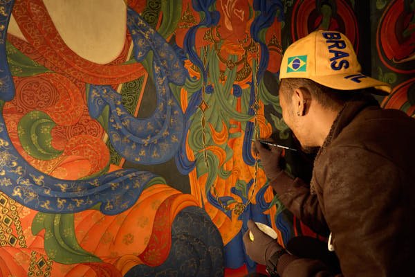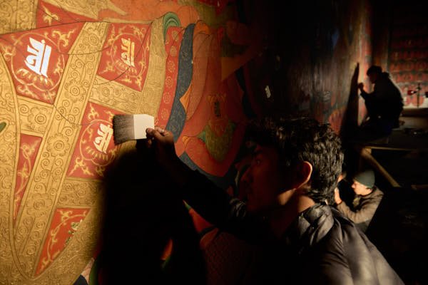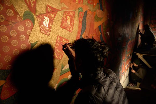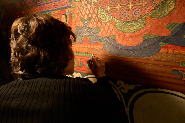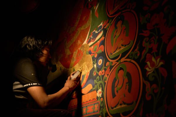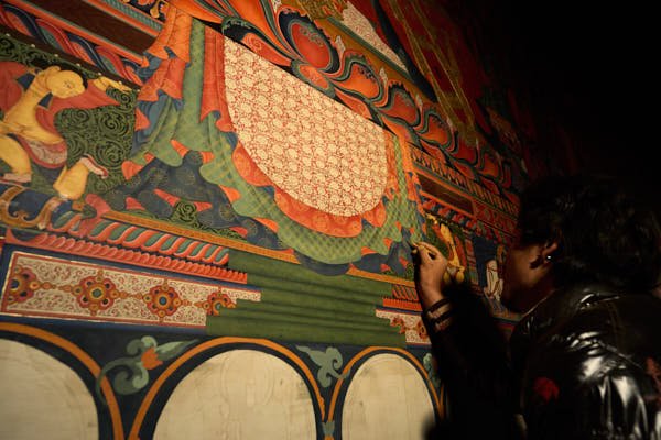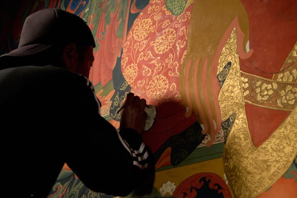 Given the religious importance of the main deities that were painted in real gold it was decided to use 24K gold powder to paint the missing parts of the main Buddhas's body parts such as legs, arms, feet and hands where missing, following the monks's request to not contaminate the body of the images with impure elements. Furthermore, the floral decorations, the brocades and the patterns of the main deities and their attendants were painted with 24K gold powder as well so as to make the joints of the new painting with the old one as seamless as possible.