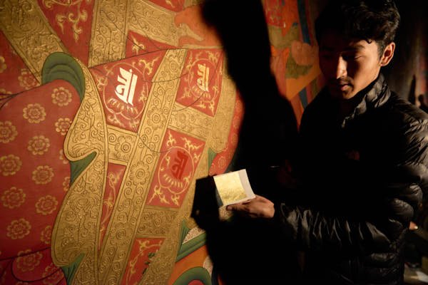 For large surfaces, the area to be gilded was previously painted with a warm orangish color to enhance the gold powder reflecting properties. The gold powder was mixed with a solution of Arabic Gum in water and then applied in several layers. Once the binder dried, the gold was polished with agate stones. 22K gold leaf was used instead for making the Sanskrit letters of the Buddhas robes following the original technique. The application of such leaf was carried out with gilders mordant.