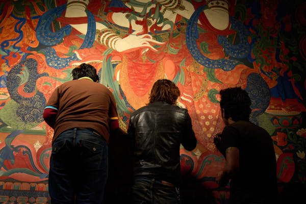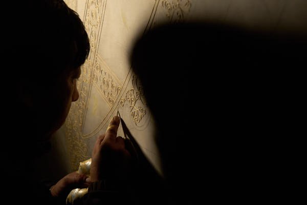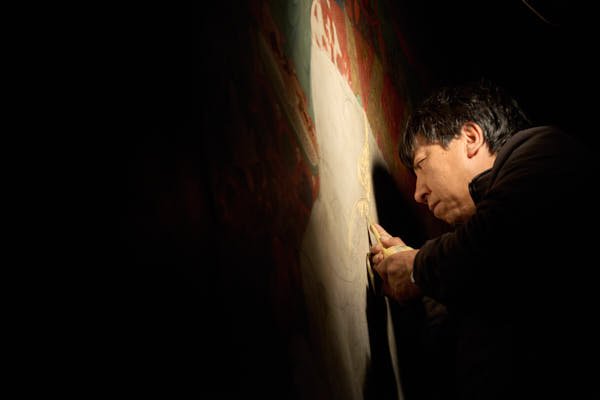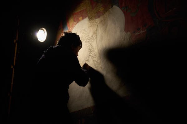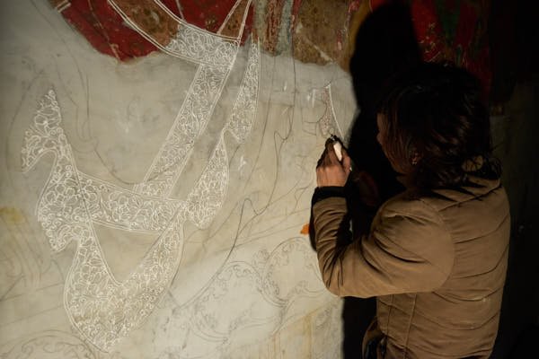 The original relief work was used to create the jewelry and the brocades of the Buddha robes. Jewels, brocades, patterns and floral decorations vary from figure to figure and they were all copied on drafting paper and reproduced accordingly. Once the drawing was transferred to the wall, the relief work was carried out by outlining the sketch with a syringe and a truncated needle filled up with an acrylic based paste. In this way the outlines of the drawing slowly became embossed.