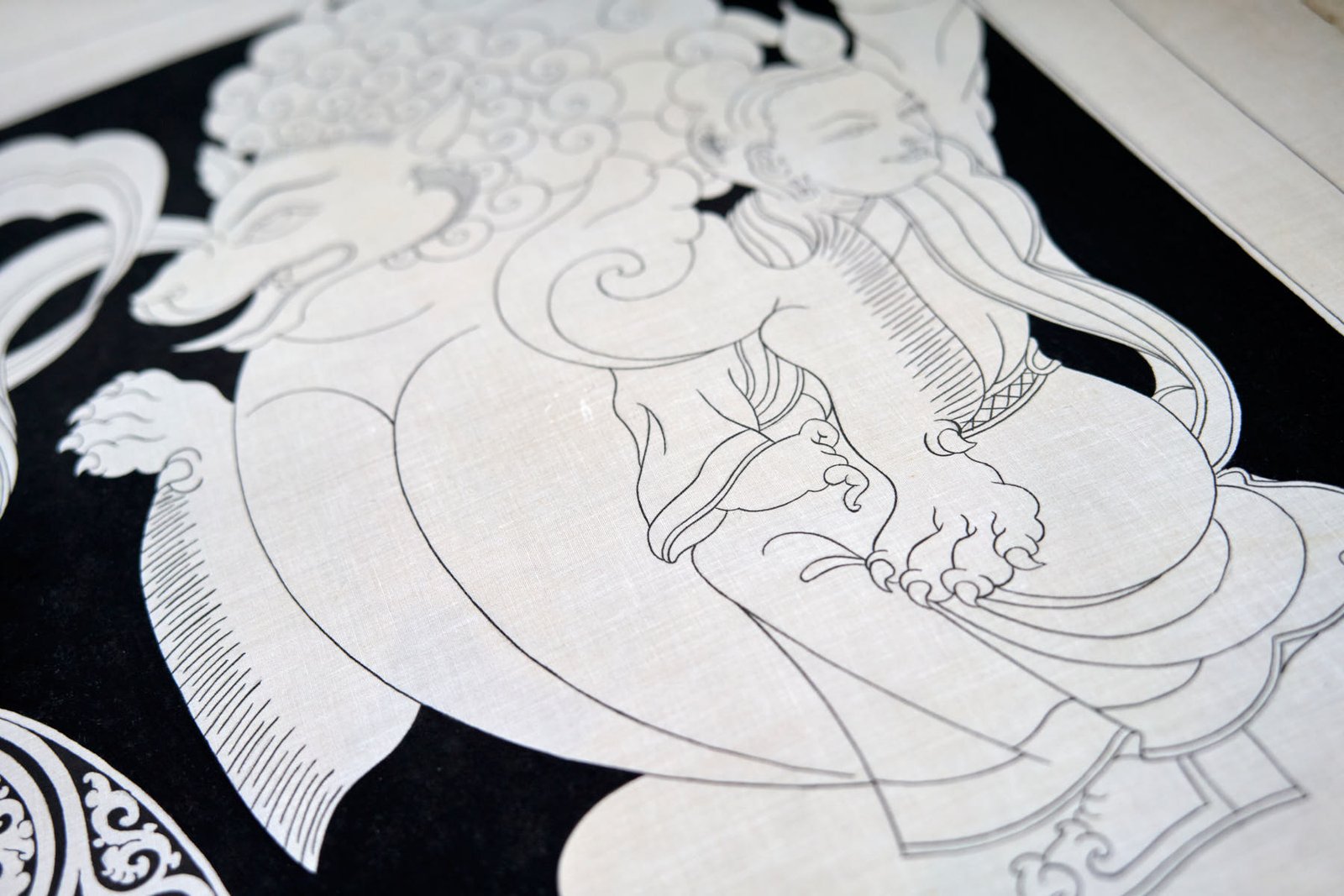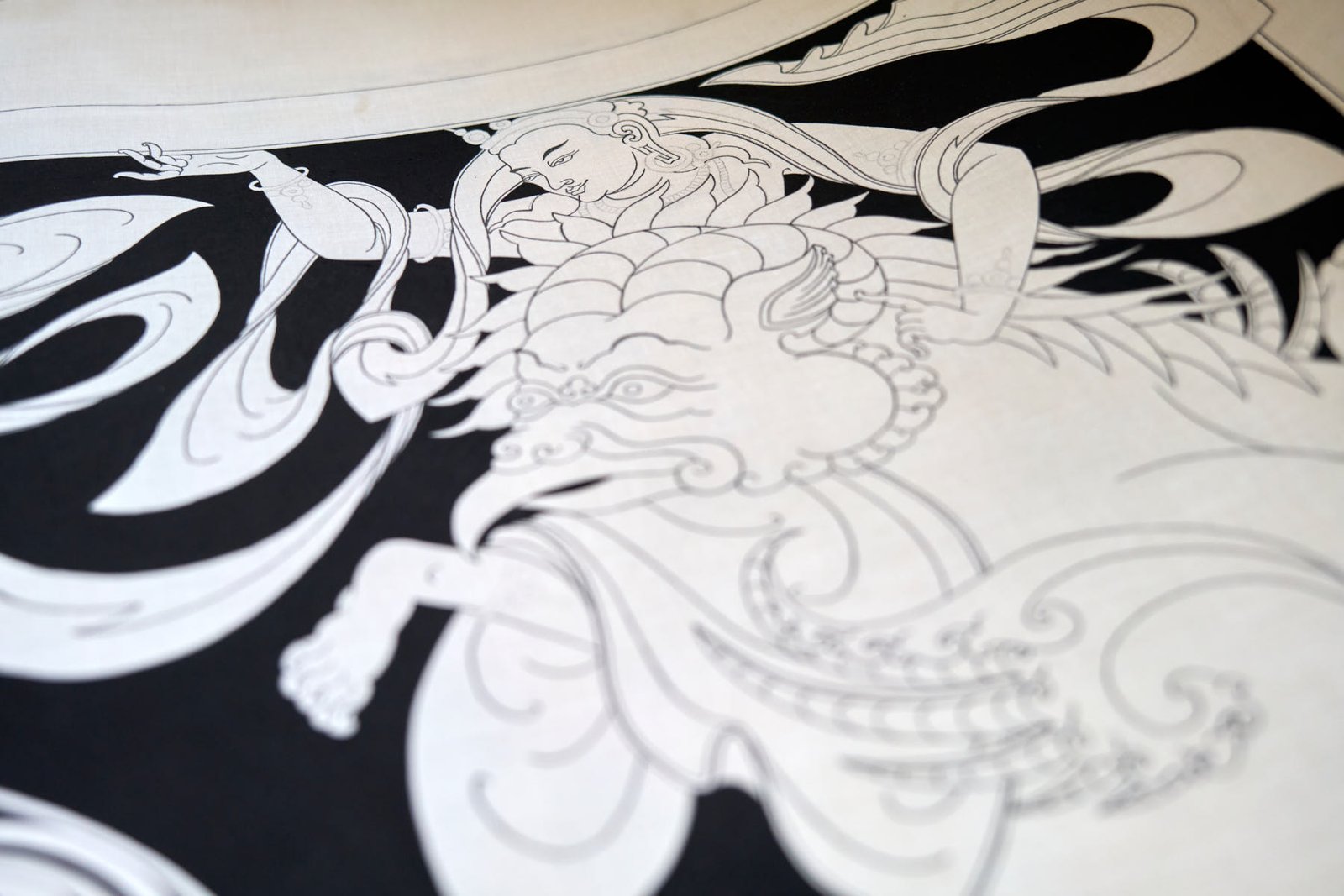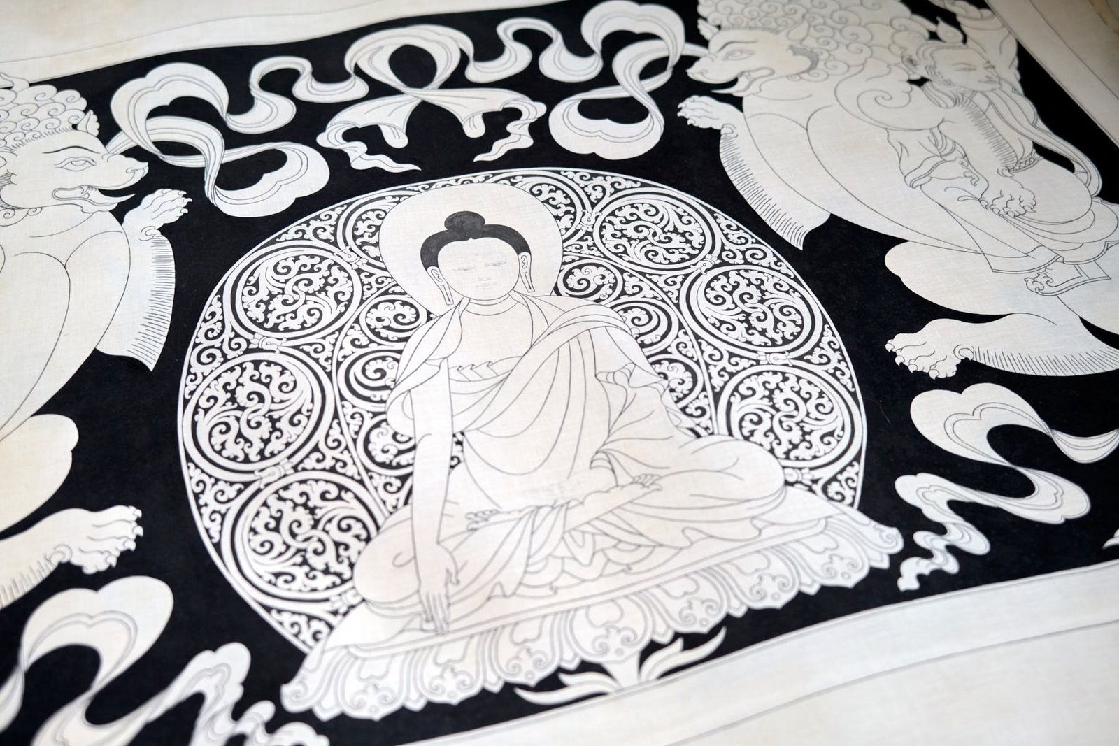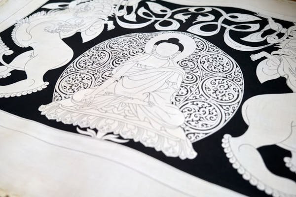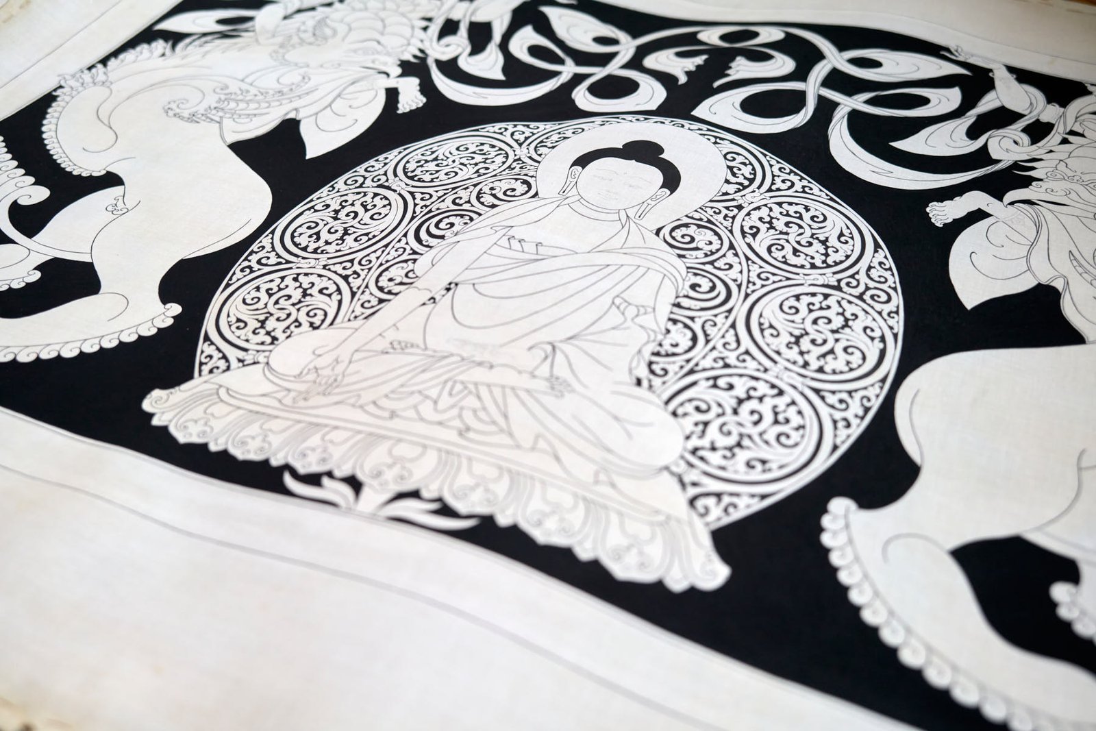 During my time in Mustang, I delved into the creation of a captivating series of black and white thangkas, drawing inspiration from the profound essence of the 5 Tathagata Buddhas. The spark for this artistic endeavor ignited while working on stunning XV-century paintings within the sacred walls of Tubchen Monastery, a place where my dedication had taken root. These awe-inspiring masterpieces served as my muse, guiding me to craft my unique designs and layouts.