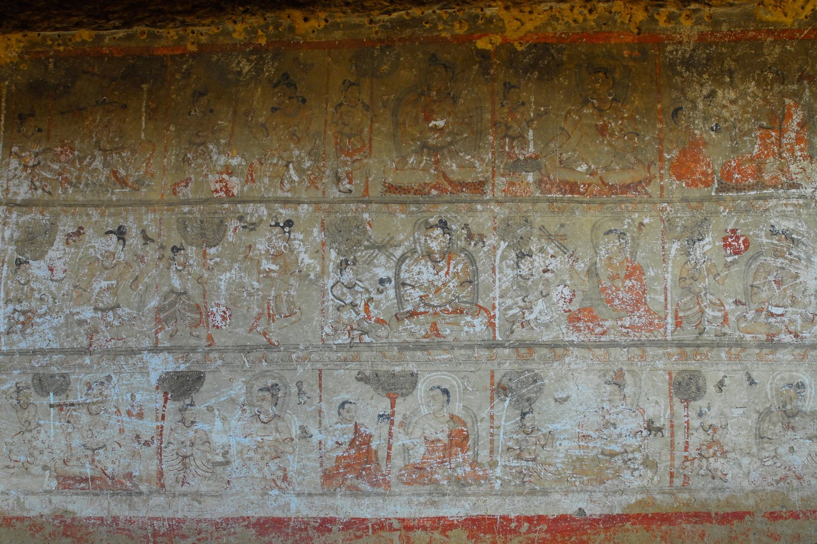 In 2007 a team co-led by U.S. researcher and Himalaya expert Broughton Coburn and veteran mountaineer Pete Athans, in collaboration with The North Face and National Geographic, scaled the crumbling cliffs on a mission to explore the human-made caves. Inside the caves, the team found ancient Tibetan Buddhist shrines decorated with exquisitely painted murals, including a 55-panel depiction of Buddha's life.